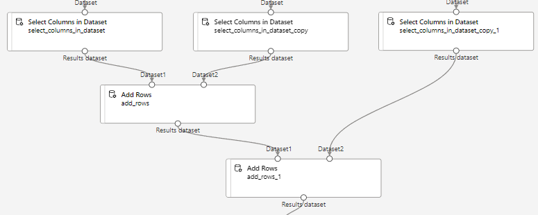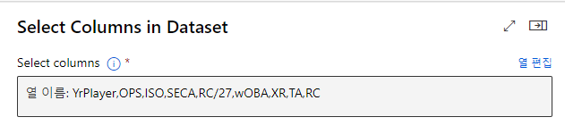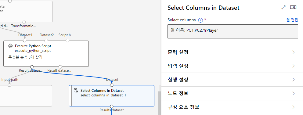 필요한 열만 남기기 위해 "Select Columns in Dataset"를 연결하고, 열 편집에 PC1,PC2,YrPlayer 추가후 저장