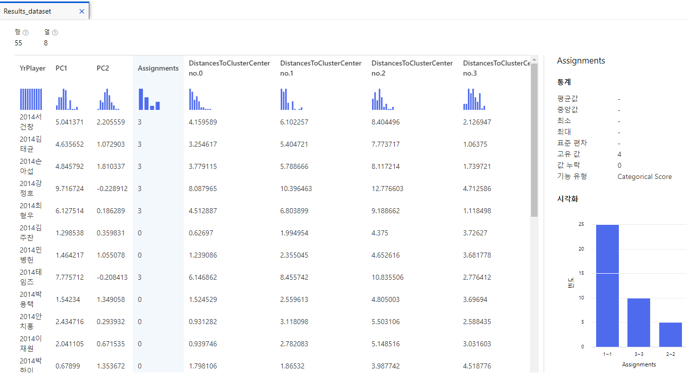 군집 0,1,2,3으로 4개로 나눠졌고, 선수마다 각 군집 중심점까지와 떨어진 거리를 알 수 있다.