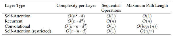 - 실제 연산량 측면(𝑂(𝑛2⋅𝑑) vs. 𝑂(𝑛⋅𝑑2) 등)에서도, 일반적인 문장 단위 변환(단어·워드피스·바이트페어)에서는 셀프 어텐션이 RNN보다 빠를 수 있다.