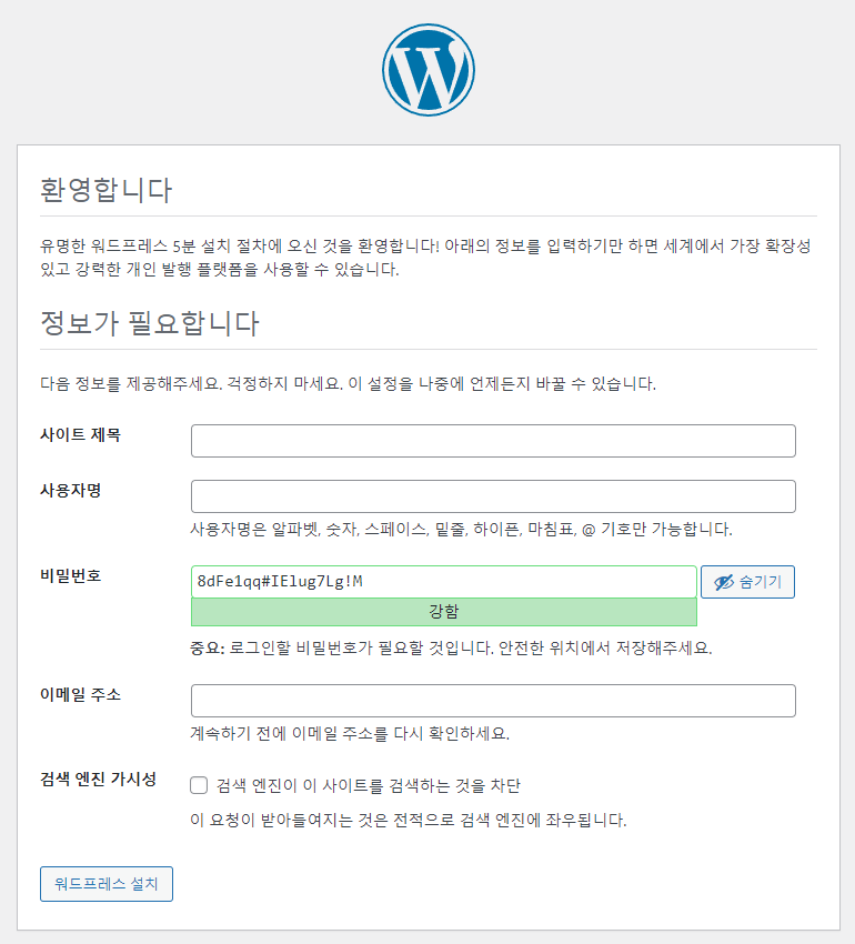 나중에 사이트 편집 화면 접속을 위해 사이트 제목, 사용자명, 비번, 이메일 주소 입력