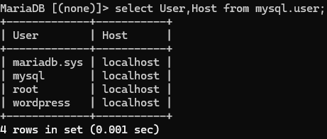 ( show GRANTS for 'wordpress'@'localhost'; : 이걸로 권한 부여 확인 )